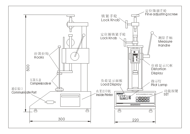 SD-10電子數(shù)顯彈簧拉壓試驗機是測試拉伸、 壓縮彈簧的變形量和負荷關系特性的專用儀器。適用拉伸、壓縮彈簧在一定工作長度下的工作負荷的測試,也可用于橡膠、簧片等彈性器件的彈力負荷測試。具有高精度高分辨率;測試方向顯示;藍色背光燈顯示;上下限偏差值設定判斷,紅綠指示燈及蜂嗚器自動聲光報警設置;可存儲10組測試數(shù)據(jù),自動計算存儲數(shù)據(jù)的平均值;三種單位N、kgf、lbf自動互換;具有峰值保持功能、峰值自動解除功能及解除時間自由設定;無操作自動關機的省電設計,關機時間自由設定;內(nèi)置打印機,可打印10組存儲的測試數(shù)據(jù)和最大值、最小值、平均值、合格或不合格值判斷等優(yōu)點。