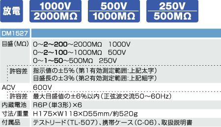 | 本器は定格電圧1000V、500V、250Vの印加電圧3レンジ式の絶縁抵抗計(jì)です。パワーオンとパワーロックが可能な2段式プッシュスイッチを採(cǎi)用。測(cè)定後、充電された電圧を放電するディスチャージ機(jī)能付きです。內(nèi)蔵電池の電池容量が簡(jiǎn)単に測(cè)れるインナーバッテリチェック機(jī)能を搭載しました。 ● 耐衝撃デザイン ● 充電された電圧を放電するディスチャージ機(jī)能 ● パワーオンとパワーロックが可能な2段式プッシュスイッチ ● パワーオンがLEDで確認(rèn)できる高圧発生インジケータ ● インナーバッテリチェック機(jī)能 ● 活線狀況を見極められる交流電圧測(cè)定機(jī)能 ● 印加電圧3レンジ切換式 |