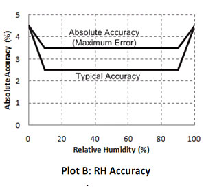 最大RH傳感器誤差1%的額外 精度: ±2.5%,從10%至90%(典型值)最大為±3.5%,其中滯后,Plot B (B圖)