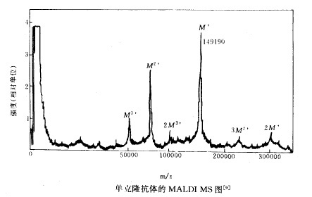 MALDI MS 法常用UV 或IR 脈沖激光,脈寬在1~100ns 。聚焦激光產(chǎn)生的離子,實(shí)際上是在空間和時間上的一點(diǎn),能非常理想地與飛行時間質(zhì)譜計(jì)結(jié)合。目前常用基體有煙酸、芥子酸、琥珀酸、甘油、尿素、Tris 緩沖液等。樣品制備簡單快速。能用于各種蛋白質(zhì)分析,實(shí)際靈敏度約1pmol(進(jìn)入MS 計(jì)),在優(yōu)化條件下,能檢出lfmol 的蛋白質(zhì)。其它生物分子如聚核昔酸、寡糖、糖脂等亦適用。分子量范圍在幾千至幾十萬道爾頓。此外,還有分析速度快(包括制樣、裝樣,10~20min 可分析一個樣品),某些高濃度基體的存在不影響Ms 分析的特點(diǎn)。這意味著在導(dǎo)入MS 計(jì)前無需除去生化處理過程中所用的緩沖液和鹽,為它與HPLC 和HPCE 的直接藕聯(lián)提供了方便。下圖是一個典型的例子??單克隆抗體(從鼠中得到,平均分子量149190士69Da )的MALDI Ms 圖。在低功率密度下,主要形成分子或準(zhǔn)分子,在高功率密度下,得到大量的MS 碎片,從而可獲得結(jié)構(gòu)信息。此法正在完善和推廣應(yīng)用之中,可以預(yù)料,今后將會在下面幾個方面擴(kuò)大應(yīng)用:① 將微柱LC 和CZE ( Capillary zone electrophoresis )禍合到LDIMS 計(jì),直接與濕法分離技術(shù)藕合;② 用于DNA 碎片超快序列分析;③ 將此離子源用于其它MS 計(jì),作多肽和小分子蛋白質(zhì)分析。
