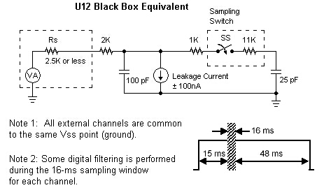 黑匣子當(dāng)量:如果一個(gè)輸入通道被取消選擇或當(dāng)不測量電壓,即輸入名義上看起來像在串聯(lián)2K電阻與一個(gè)100pF的電容。 漏電流可能看起來像一個(gè)標(biāo)稱5M阻力。 當(dāng)切換到AD電路進(jìn)行測量時(shí),該輸入看起來像一個(gè)12K電阻串聯(lián)一個(gè)為25pF電容器已被添加到網(wǎng)絡(luò)。 一些數(shù)字濾波采樣窗口期間執(zhí)行。