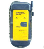 | 致冷氣體泄漏氣體檢測儀SRD100 一、測量范圍: 任何鹵素族氣體測試,其中包括常用制冷劑中的大部分氣體(如CFC, HCFC, HFC) 鹵素復(fù)合物(如SF6 ,全氯乙烯及含鹵素的氣體) 注意:國際上使用R代表制冷劑。國內(nèi)使用F。如R-12代表F-12,R-22代表F-22可將F替換為R 以下列出本儀器可檢測的部分氣體: CFC : R11, R12, 113等 HCFC : R22, R502, R500等 HFC : R134A, R123, R125, R23等 還可檢測其它鹵族化合物如SF6,全氯乙烯及含鹵素的氣體。 二、規(guī)格: -.感應(yīng)器:先進的電離檢測 -.靈敏度:0.4 OZ/年(11.34克/年)134A依據(jù)LS-20泄漏標準 -.指示器:聽覺:可調(diào)“滴嗒”速率 視覺:閃爍“LED” -.響應(yīng)時間:瞬時 -.工作周期:連續(xù) -.預(yù)熱時間:10秒 -.電源:1枚9V電池 -.電池壽命:16小時 -.尺寸(英寸):7 1/4”(H)×3 1/4”(W)×1 3/8”(D) -.探頭長度(英寸):18” -.重量:504g 三、操作步驟: 1.在無污染環(huán)境下將儀表旋鈕打到“ON”位置 2.儀表開機后綠色電源燈將點亮,如果電量不足,紅色低電池指示燈將亮起且“嘀嗒”速率將不可調(diào)。 3.用轉(zhuǎn)輪調(diào)到一個低的“嘀嗒”速率,紅色泄露指示燈將隨“嘀嗒”速率的快慢閃爍。 4.要定位發(fā)生泄露的地點,將探頭嘴沿泄漏區(qū)進行檢查,當(dāng)您越接近泄漏點“嘀嗒”速率聲將會越快。為更容易辨清泄漏源可以將“嘀嗒”速率調(diào)慢一點。當(dāng)您遠離泄漏源市“嘀嗒”速率將會減慢。 5.在嘈雜環(huán)境中測量時,可以監(jiān)視紅色泄漏指示燈,當(dāng)“嘀嗒”速率變快時,指示燈閃動頻率也越快。 6.如果“嘀嗒”速率變得不可控制,可能需要更換探頭過濾器或探頭本身。探頭過濾器可以卸下并可用酒精和壓縮空氣清洗 7.建議每年更換一次探頭。 四、更換探頭過濾器及更換探頭 要更換探頭過濾器,將探頭的黑色嘴從蛇皮管組件上拉出。 要更換探頭請按以下步驟 1.將儀表關(guān)機 2.將探頭逆時針擰下 3.更換新探頭后順時針擰緊 注: 更換或清潔探頭前請將儀表關(guān)機,否則可能會有輕微觸電感。 |