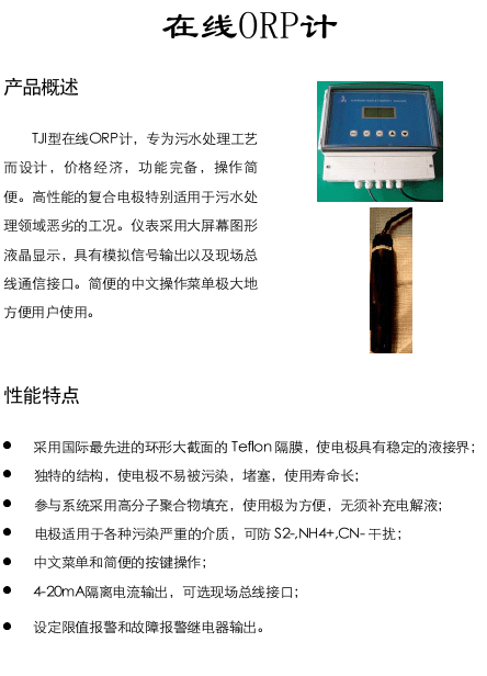 JKTJL型在線ORP計,專為污水處理工藝而設(shè)計,價格經(jīng)濟,功能完備,操作簡便。高性能的復(fù)合電極特別適用于污水處理領(lǐng)域惡劣的工況。儀表采用大屏幕圖形液晶顯示,具有兩路模擬信號輸出以及現(xiàn)場總線通信接口。