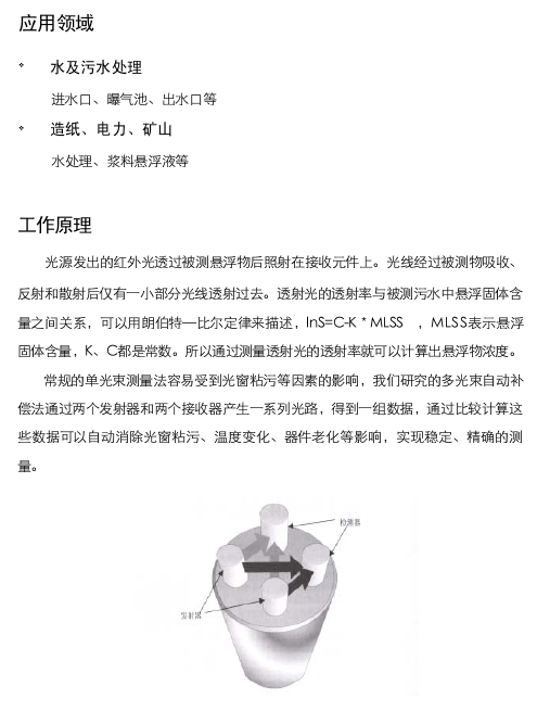 JKMLSS型懸浮物濃度計,采用創(chuàng)新的多光束相互補(bǔ)償技術(shù),能夠消除傳感器光窗粘污造成的測量誤差,明顯提高測量精度,減少維護(hù)工作量,提高工作可靠性,特別適用于污水處理領(lǐng)域惡劣的工況。此外,傳感器帶有空氣吹掃清洗功能,通過外接壓縮空氣可以實現(xiàn)儀表的自動定時清洗功能
