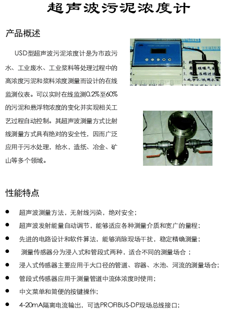 JKUSD型超聲波污泥濃度計是為市政污水、工業(yè)廢水、工業(yè)漿料等處理過程中的高濃度污泥和漿料濃度測量而設(shè)計的在線測量儀表?梢詫崟r在線監(jiān)測0.2%至60%的污泥和懸浮物濃度的變化并實現(xiàn)相關(guān)工藝過程自動控制。其超聲波測量方式比射線測量方式具有絕對的安全性,應而廣泛應用于污水處理廠,給水、造紙、冶金、礦山等多個領(lǐng)域。
