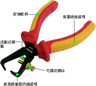 PM-910, VDE 1000V 頂切剝線鉗(160mm) [電工剪鉗類] 特點:. 通過德國VDE和GS品質(zhì)認證,符合IEC 60900耐高壓1000V 安全規(guī)范。. 人體工學(xué)雙色手柄,膠柄采用耐高壓、耐燃材質(zhì)制造。. 本體采用鉻釩鋼打造,刀口經(jīng)硬化處理,表面鐡氟龍防銹處理。