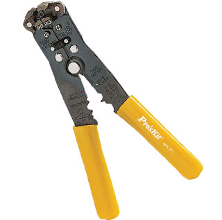8PK-371, 多功能自動(dòng)剝剪壓線鉗(0.13~6.0m[剝線鉗類]. 全長(zhǎng): 210mm. 不需調(diào)整即可輕易剝線. 對(duì)于線中央剝線, T型搭線更是便利. 功能多, 鋼材特殊硬化處理, 壽命長(zhǎng). AWG 24~10 (0.2~6.0mm2) 范圍內(nèi)均可剝線