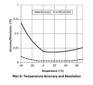 范圍: -20°C至70°C(-4°至158°F)精度: ±0.21°C從0°到50°C(±0.38°F 32°至122°F),Plot A (A圖)