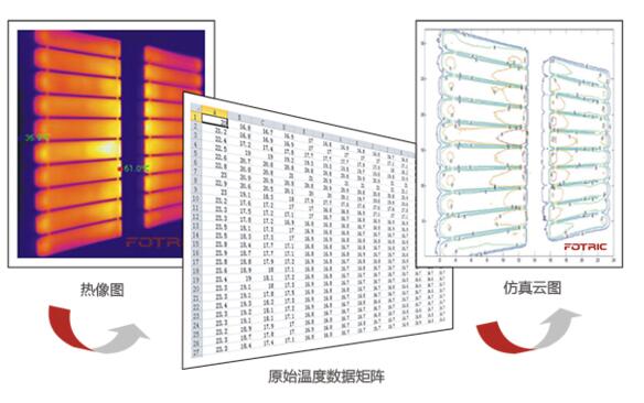 您可以選擇任意幀熱像畫面另存為全輻射熱像圖,導(dǎo)出該圖全部像素點(diǎn)原始溫度值的.CVS格式數(shù)據(jù)表格,這些原始數(shù)據(jù)有助您優(yōu)化算法,或是用其他軟件生成仿真云圖。
